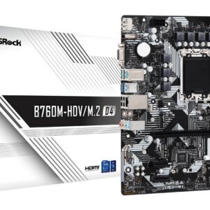 Asrock B760M-HDV/M.2 D4. Processor manufacturer: Intel, Processor socket: LGA 1700, Compatible processor series: Intel® Core™ i3, Intel® Core™ i5, Intel® Core™ i7, Intel® Core™ i9. Supported memory types: DDR4-SDRAM, Maximum internal memory: 64 GB, Memory slots type: DIMM. Supported storage drive interfaces: M.2, SATA III, RAID levels: 0, 1, 5, 10. Ethernet interface type: Gigabit Ethernet, LAN controller: Realtek RTL8111H. Component for: PC, Motherboard form factor: micro ATX, Motherboard chipset family: Intel
