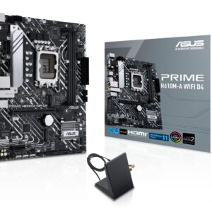 ASUS PRIME H610M-A WIFI D4. Processor manufacturer: Intel, Processor socket: LGA 1700, Compatible processor series: Intel® Celeron®, Intel® Core™ i3, Intel® Core™ i5, Intel® Core™ i7, Intel® Core™ i9,…. Supported memory types: DDR4-SDRAM, Maximum internal memory: 64 GB, Memory slots type: DIMM. Supported storage drive interfaces: M.2, SATA, Supported storage drive types: HDD & SSD. Ethernet interface type: Gigabit Ethernet, Top Wi-Fi standard: Wi-Fi 5 (802.11ac), Wi-Fi standards: 802.11a, 802.11b, 802.11g, Wi-Fi 4 (802.11n), Wi-Fi 5 (802.11ac). Component for: PC, Motherboard form factor: micro ATX, Motherboard chipset family: Intel