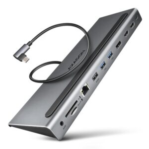 The robust aluminum body ensures mechanical resistance and quality cooling of the docking station. The wedge shape of the hub encourages its use as a laptop pad for better cooling and ergonomic positioning. Also, the included USB-C cable is designed to use the hub as a laptop pad, the optimal length of 40 cm together with the curved connector allows it to be almost entirely hidden under the laptop and contribute to the impression of a clean desk. The USB-C cable is detachable and can be replaced with a longer cable if needed.