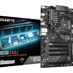 GIGABYTE B550 EAGLE Motherboard – AMD Ryzen 5000 G-Series CPUs, 10+3+1 Phases VRM, up to 3200MHz DDR4, 1xPCIe 4.0 + 1xPCIe 3.0 M.2, 1GbE LAN, USB 3.2 Gen 2. Processor manufacturer: AMD, Processor socket: Socket AM4, Compatible processor series: AMD Ryzen 3000 Series, AMD Ryzen 4000 Series, AMD Ryzen 5000 Series. Supported memory types: DDR4-SDRAM, Maximum internal memory: 128 GB, Memory slots type: DIMM. Supported storage drive interfaces: M.2, PCI Express 4.0, SATA III, Supported storage drive types: HDD & SSD, RAID levels: 0, 1, 10. Maximum resolution: 4096 x 2160 pixels. Ethernet interface type: Gigabit Ethernet, LAN controller: Realtek RTL8111H