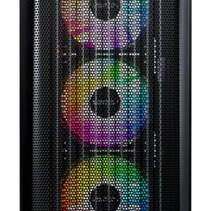 Передняя панель с высокопроницаемой сеткой (пористость до 33%) обеспечивает эффективный забор воздуха и стабильную работу системы даже под нагрузкой. В комплекте уже установлены 4 ARGB-вентилятора с 25 режимами подсветки, которые можно переключать кнопкой или синхронизировать с материнской платой.